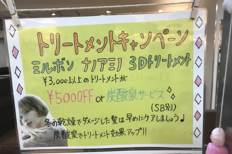 3000円以上のトリートメント(ホームケア付き)500円引きor炭酸泉サービスは引き続き行います。
